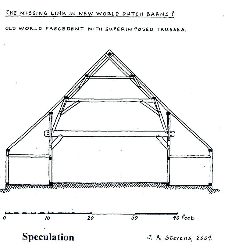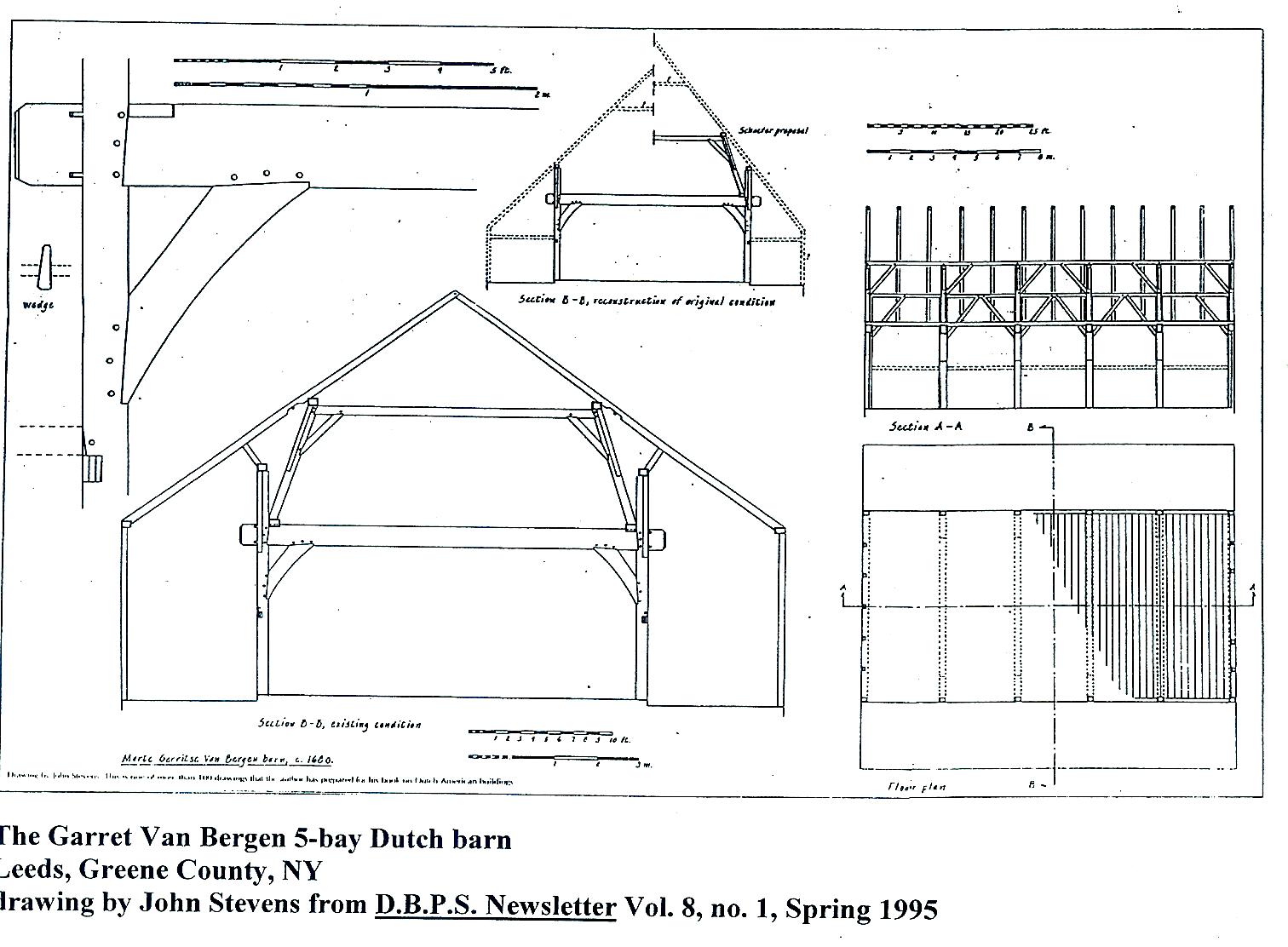 Sinclair, Editor John R. Stevens on The Solite Dutch Barn <-Click for larger view) The Nieuwkirk and 'Solite' barns represent, with their relatively complex roof construction, the earliest surviving specimens of Dutch-American barns. In the absence of other early specimens it is difficult to assess how representative they are of early building practices. The example from the Netherlands illustrated on page 9 of the report sent out with the last newsletter is from the Berends book... Houtconstructies.. .It is a strikingly close parallel to the American examples. However, many old-world Dutch barns, particularly those in the larger size range, have even more complex roof construction. Many examples are shown in the Brends book. Trusses are erected on top of the anchor beam, consisting of angled struts joined at the top with a tie and carrying rafter-supporting purlins. This same construction is also used in the roofs of houses The only American barn to survive into the recent past with this construction was the Garret Van Bergen barn, formerly at Leeds, Greene County, New York. It was reputed to have been built in the 1680's. Greg Huber, in his revision of John Fitchen's New World Dutch Barn (2002) revises the dating of this barn to 1729, the construction date of the still extant Garret Van Bergen house (see Huber, page 185) Huber's dating is very possibly correct. Dendrochronology could have determined the dating, but we are only now employing this technique to date Dutch-American buildings (in contrast, dendro dating is very advanced in the dating of early New England houses). The Van Bergen barn had a superimposed truss system carrying purlins, very similar to that used in Old World Dutch barns. The late Vince Schaeffer was of the opinion that the Van Bergen barn trusses were an original structural feature, and from my observation, the craftsmanship employed in them was not really distinguishable from the original H-bent framing. The barn had been rebuilt in the early 19th century when the side walls were replaced with higher walls and the rafters of a moderately pitched roof were supported on the truss purlins. The original purlins became redundant. Vince Schaeffer, in his belief that the trusses were an original feature, proposed a reconstruction of the barn in which the rafters were in contact with both purlins. This made a very steep roof (but not unlike the known roof pitches of houses of the time, like the Pieter Winne house of the 1720's) and unduly narrow (to my way of thinking) side aisles. The original rafters were re-used in the 19th century rebuild, and they showed redundant notches and broken pins and only a single bearing point where they had lain on, and been pinned to, the purlins. The writer is of the opinion that the trusses, because of their resemblance to Old World examples are a kind of 'red herring' and in spite of the craftsmanship in their being so similar to the original work, they were in fact part of the early 19th century rebuilding. Barns built in the 17th century, some of which are known from contracts to have been of considerable size might have had complex roof construction composed of superimposed trusses. This has to be speculative, however, since there are no known surviving Dutch-American barns from the 17th, or early 18th centuries. (Click for larger view) ANNUAL MEETING From the Editor: Eleven People attended the special meeting of HVVA Saturday, February 14, at the Marbletown Firehouse, Ulster County. Two new board members were voted in and a change was made in the make-up of the officers. The following was adopted: Alvin