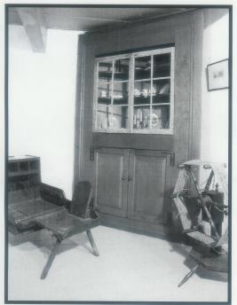 <-Click for larger view. Lasher Family Corner Cupboard in The Germantown Parsonage Germantown, Dutchess County, NY (The cobblers bench is kept in memory of Henry Person.)