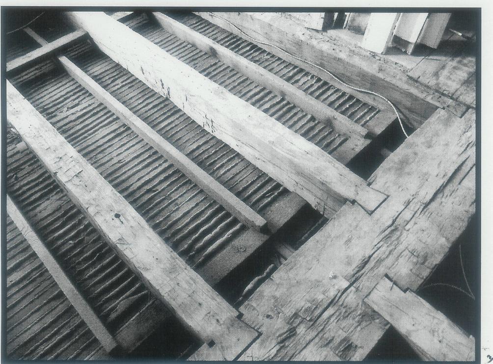 On September 9th, 1989, the Ekert collection was sold at the Pleasant Valley Auction House in southern Dutchess County. The dollar amount is still a matter of local speculation. Two or three Ekert items have found their way back home since the auction; one is a well-worn cobbler’s bench acquired in the memory of Henry Person, whose shoe making trade is listed in the 1850 census. (Alvin Sheffer and Marguerite V. Riter, helped with this report.) THE GENERAL PUTNAM HOUSE After the meeting, a small group of members went to the General Putnam house in Upper Red Hook (Dut-Rh-21) where Todd Scheff is doing some structural work leveling a ceiling. Some of us had briefly visited this 2-story brick house last month. We had seen that the frame was English, with summer beams and plastered ceilings, but we had put it off as an early Federal example not understanding the roof change with king posts and a ridge beam. On this second examination we discovered that the king posts were reused queen posts from a gambrel roof and that one of the owners, probably when the house was Victorianized, changed the roof from a gambrel to a gable, more in keeping with the fashion of the late 19th century. (Click to see larger view.) Reconstruction of the Gambrel Roof and Details of its English Joinery General Putnam House, Upper Red hook, Dutchess County, NY. There is evidence of three types of joints in the surviving plate. These are 1) a vertical mortise and lap dovetail that joins the plate to the post and the tie beam; 2) a step-lap for the upper rafter; and 3) a shouldered gain with a lap dovetail to hold ties without posts. A clue to its ethnicity came when we recognized the reused posts as classic English flared posts. They are found on Long Island but these are the only examples of this New England type of timber framing that we know of in the Hudson Valley. They raise some interesting questions, since it is thought by a number of writers that the gambrel roof form was borrowed by fashionable people in the Hudson Valley from New England. In the structure of Hudson Valley gambrel roofs there is a clear distinction between English and Dutch design, queen posts versus collar ties. General Putnam House Upper Red Hook, Dutchess County, N.Y. The floor boards have been removed exposing the first period New England type construction of about 1760. A large summer beam holds the lighter floor joists, many of which are joined with lap dovetails. A lighter structure of sawn and nailed, circa 3-inch framing, supports the riven lath and the plastered ceiling which is squeezed between the lath to bond the two. The Hudson Valley Dutch did not plaster their ceilings, they exposed the anchorbeams and the undersides of the floor boards. Could it be that the Putnam House was an early imported example of the gambrel form that became very popular here in the 1760? The plaster lath is riven and the nails forged. It was probably Georgian rather than Federal and pre-dated General Putnam. We erroneously reported that the historic marker dates the house to 1740. The present owner, who has some background on the house, believes it may date to 1750. Jim Decker put us on to this 1933 HABS photo of the Gambrel roof house across the road. We will try to examine its loft. It no longer has its Victorian porch.