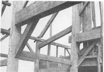 H-frame columns of oak and anchorbeams of pine. This blending of