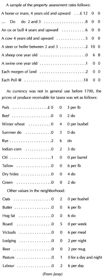 The colonial farmer paid taxes much as we do today. The big difference was the method used to calculate the tax. In the late 1600's assessments were based on Poll, land and animals while today they are based on land and buildings.