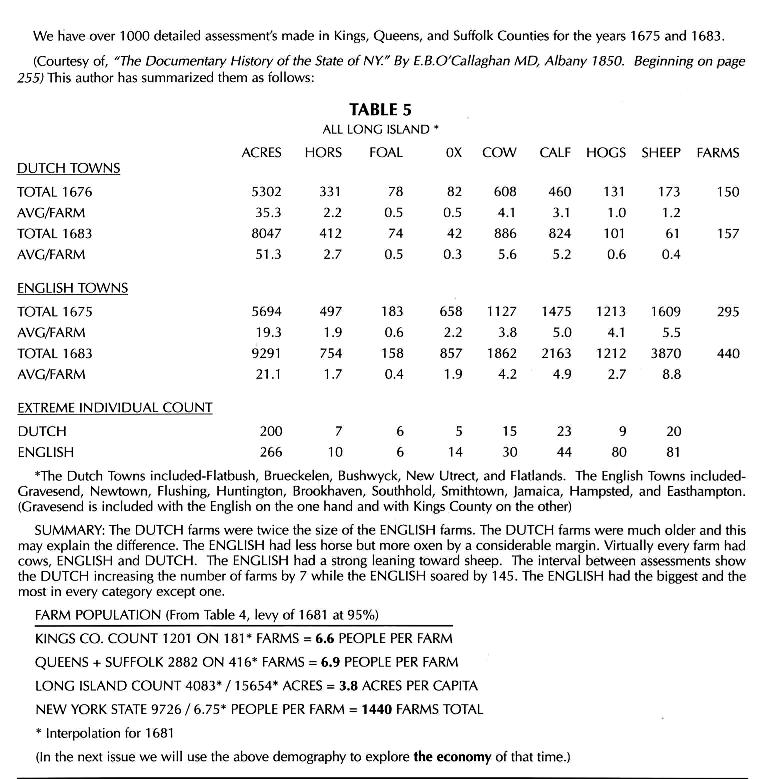 SUMMARY: The DUTCH farms were twice the size of the ENGLISH farms. The DUTCH farms were much older and this may explain the difference. The ENGLISH had less horse but more oxen by a considerable margin. Virtually every farm had cows, ENGLISH and DUTCH. The ENGLISH had a strong leaning toward sheep. The interval between assessments show the DUTCH increasing the number of farms by 7 while the ENGLISH soared by 145. The ENGLISH had the biggest and the most in every category except one.