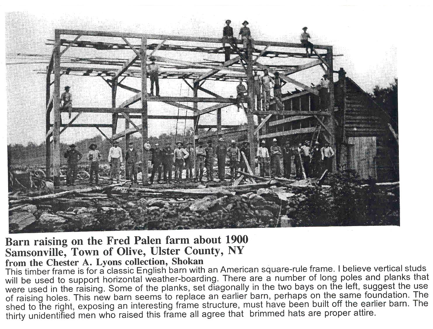 the JOURNAL After Lunch we stopped at the circa 1720 brick, frame and stone Winne/Creble house in Bethlehem, Albany County. The new tall rafters are going up. Brian Parker the new owner. showed us the latest discoveries. The archaeologists have uncovered the stone base for the cellar fireplace brick flue. It accounts for the reworked brick in the back wall. Also the stone foundation of a small slaves-quarters/summer-kitchen building separated by about 8 to 10 feet from the house. A turn of the century photograph shows it still standing. A stain on the brick shows how its roof joined the wall of the house. Photographs of the missing fireplace paneling in the stone addition have been discovered. They match the fragments we rescued from the cellar last year. Saturday September, 16 About 6 people met at the Oliver barn (Mar-6) in Marbletown and talked for an hour about business and upcoming events. George Van Sickle led us on a short motor trip through some lesser known parts of Marbletown. We passed many stone houses and barns. We stopped or slowed-down to check out four Dutch barns, no one was home: