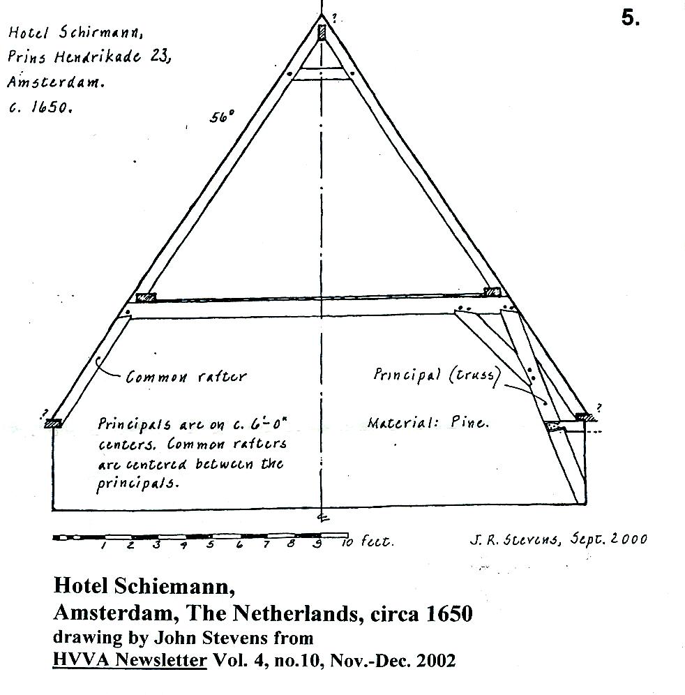 Sinclair, Editor John R. Stevens on The Solite Dutch Barn <-Click for larger view) The Nieuwkirk and 'Solite' barns represent, with their relatively complex roof construction, the earliest surviving specimens of Dutch-American barns. In the absence of other early specimens it is difficult to assess how representative they are of early building practices. The example from the Netherlands illustrated on page 9 of the report sent out with the last newsletter is from the Berends book... Houtconstructies.. .It is a strikingly close parallel to the American examples. However, many old-world Dutch barns, particularly those in the larger size range, have even more complex roof construction. Many examples are shown in the Brends book. Trusses are erected on top of the anchor beam, consisting of angled struts joined at the top with a tie and carrying rafter-supporting purlins. This same construction is also used in the roofs of houses The only American barn to survive into the recent past with this construction was the Garret Van Bergen barn, formerly at Leeds, Greene County, New York. It was reputed to have been built in the 1680's. Greg Huber, in his revision of John Fitchen's New World Dutch Barn (2002) revises the dating of this barn to 1729, the construction date of the still extant Garret Van Bergen house (see Huber, page 185) Huber's dating is very possibly correct. Dendrochronology could have determined the dating, but we are only now employing this technique to date Dutch-American buildings (in contrast, dendro dating is very advanced in the dating of early New England houses). The Van Bergen barn had a superimposed truss system carrying purlins, very similar to that used in Old World Dutch barns. The late Vince Schaeffer was of the opinion that the Van Bergen barn trusses were an original structural feature, and from my observation, the craftsmanship employed in them was not really distinguishable from the original H-bent framing. The barn had been rebuilt in the early 19th century when the side walls were replaced with higher walls and the rafters of a moderately pitched roof were supported on the truss purlins. The original purlins became redundant. Vince Schaeffer, in his belief that the trusses were an original feature, proposed a reconstruction of the barn in which the rafters were in contact with both purlins. This made a very steep roof (but not unlike the known roof pitches of houses of the time, like the Pieter Winne house of the 1720's) and unduly narrow (to my way of thinking) side aisles. The original rafters were re-used in the 19th century rebuild, and they showed redundant notches and broken pins and only a single bearing point where they had lain on, and been pinned to, the purlins. The writer is of the opinion that the trusses, because of their resemblance to Old World examples are a kind of 'red herring' and in spite of the craftsmanship in their being so similar to the original work, they were in fact part of the early 19th century rebuilding. Barns built in the 17th century, some of which are known from contracts to have been of considerable size might have had complex roof construction composed of superimposed trusses. This has to be speculative, however, since there are no known surviving Dutch-American barns from the 17th, or early 18th centuries. (Click for larger view) ANNUAL MEETING From the Editor: Eleven People attended the special meeting of HVVA Saturday, February 14, at the Marbletown Firehouse, Ulster County. Two new board members were voted in and a change was made in the make-up of the officers. The following was adopted: Alvin