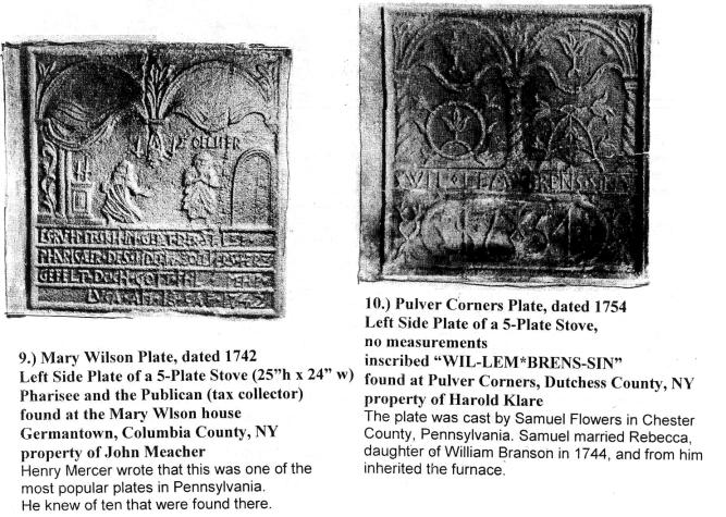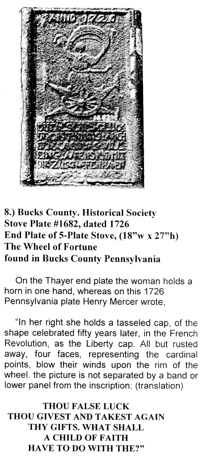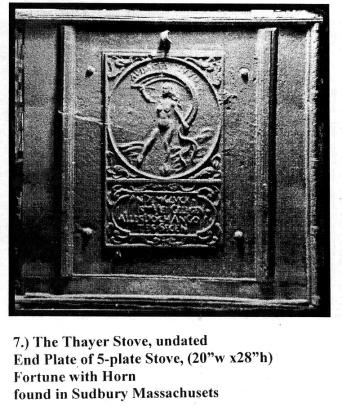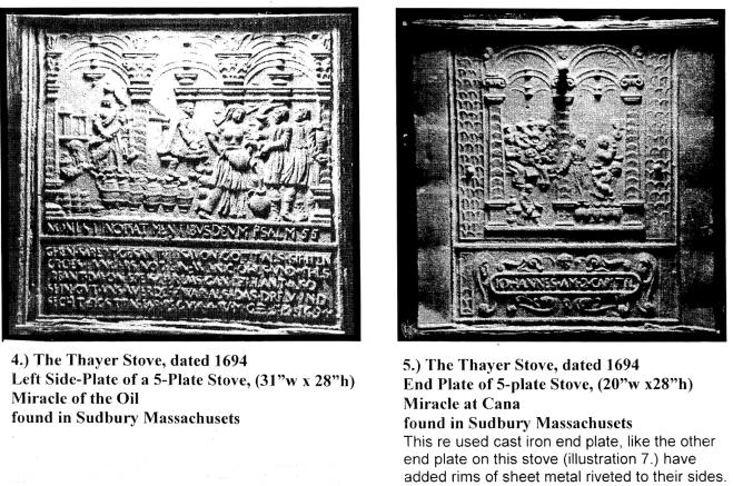 early 18th century there was a One interesting stove that might help answer the question of where and when the new style jamb stove developed is the Thayer stove in Sheffield, Massachusetts, owned by Robert Thayer, an antique dealer (Illustrations 4, 5, and 7). This stove is a unique reconfiguration of three cast iron plates from two Jamb stoves that have been riveted together with sheet metal to form an iron box 31"x31" by 29" high. One side had full double doors, now missing. The box has no other opening than the double doors and its use remains a mystery. The stove was recovered from a lake in Sudbury, Massachusetts, and was said to have been used in the upper floor of a carding mill before the building collapsed into the water. There is evidence in the repair of one plate that they were used in stoves before being reconfigured but their undamaged surfaces are extraordinary. Most stove plates that have survived recycling were used face down as steps or most commonly as firebacks to protect the masonry of the fireplace and so most are eroded and broken. Two of the three figured plates of the Thayer stove seem to be the side and front plate of a 5-plate stove dated 1694. They have the typical Old and New Testament subjects done in a very sophisticated style. Many of the decorative features of the Thayer plates match the Yates plate. Thc two stoves were different in proportion which may account for the Yates Cana being on the side whereas Thayer and Van Leuren plates have it on the end. On first seeing the Yates plate (Illustration 1. and 2.) I guessed it was German by its style but it bothered me that, despite the missing section on the upper right, it did not seem to have had notches like the Van Leuren plate (Illustration 3). I assumed the two 1694 Thayer plates (Illustrations 4 and 5) must also have these notches but they were hidden under the sheet metal in the reconfiguration. Judging by style, the second end plate of the Thayer stove (illustration 7) with the single female figure is German, but it is a. new style end plate with attached gutters, a style thought to be American. Was this plate cast in Germany or was the mold board brought to America and cast here? There appears to be a connection in subject between the Thayer end plate and two end plates (Mercer Numbers 59 and 60, Illustration 8) in Henry Mercer's Bible in Iron, that he titled "The Wheel of Fortune." They are dated 1726. Mercer thought these were the earliest examples of plates cast in America, at the Colebrookdale Furnace in Pennsylvania that was founded in 1720. More might be learned about these stoves by examining
