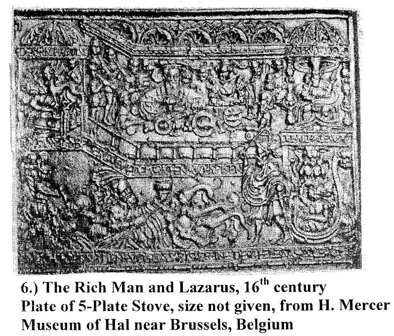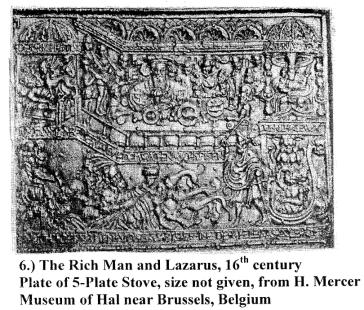 hearth or fireplace. The stove is built into Since the 16th century the plates of German jamb stoves have been elaborately decorated, usually with biblical scenes. They were the work of the mold carver who cut the wood patterns from which the sand molds were made and into which the molten metal was pored to cast the plates. This form of mass produced art, like the publishing of books and prints at that time, saw its full flowering during the mid 16th century with masterpieces of composition and allegory like "The Rich Man and Lazarus" plate in Belgium, works that rivaled the engravings of Durer but are less well known today.