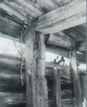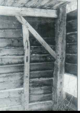 one time and the summer kitchen added later. The eastern half of the cellar has a jambed fireplace, finished beams, joists and trim. The 8 X 8 inch joists are set on 2 foot centers. It seems designed as a kitchen. The western half of the cellar is unfinished and was for storage. It has 1'6" deep opening at the west wall with remains of a trimmer arch. This may have supported a chimney for a stove above. The framing of the cellar has an English feel like that for a center chimney house with summer beams and joists. Internal brick walls in the cellar support the summer beams that support the internal walls above them. This cellar brick wall design was unknown to me. The exterior stone work of the foundation is made of large, decorative and well dressed stone. The lintels are all of stone. The pitch of the roof is low in character with its modest, unsymmetrical, Greek revival style. It is a vernacular interpretation of the style and retains little of the region's Dutch heritage. (Above) Exposed First Floor Beams in The Cellar